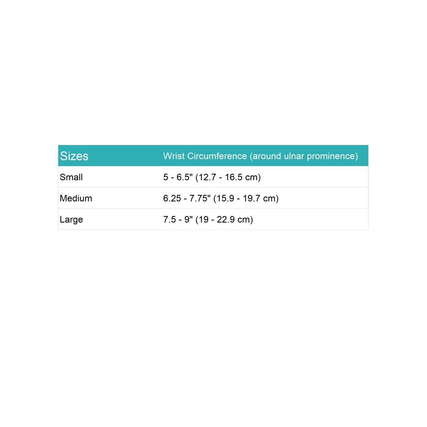 Sizes Wrist Circumference (around ulnar prominence) Small 5 - 6.5" (12.7 - 16.5 cm) Medium 6.25 - 7.75" (15.9 - 19.7 cm) Large 7.5 - 9" (19 - 22.9 cm) - Ask A Question (6)