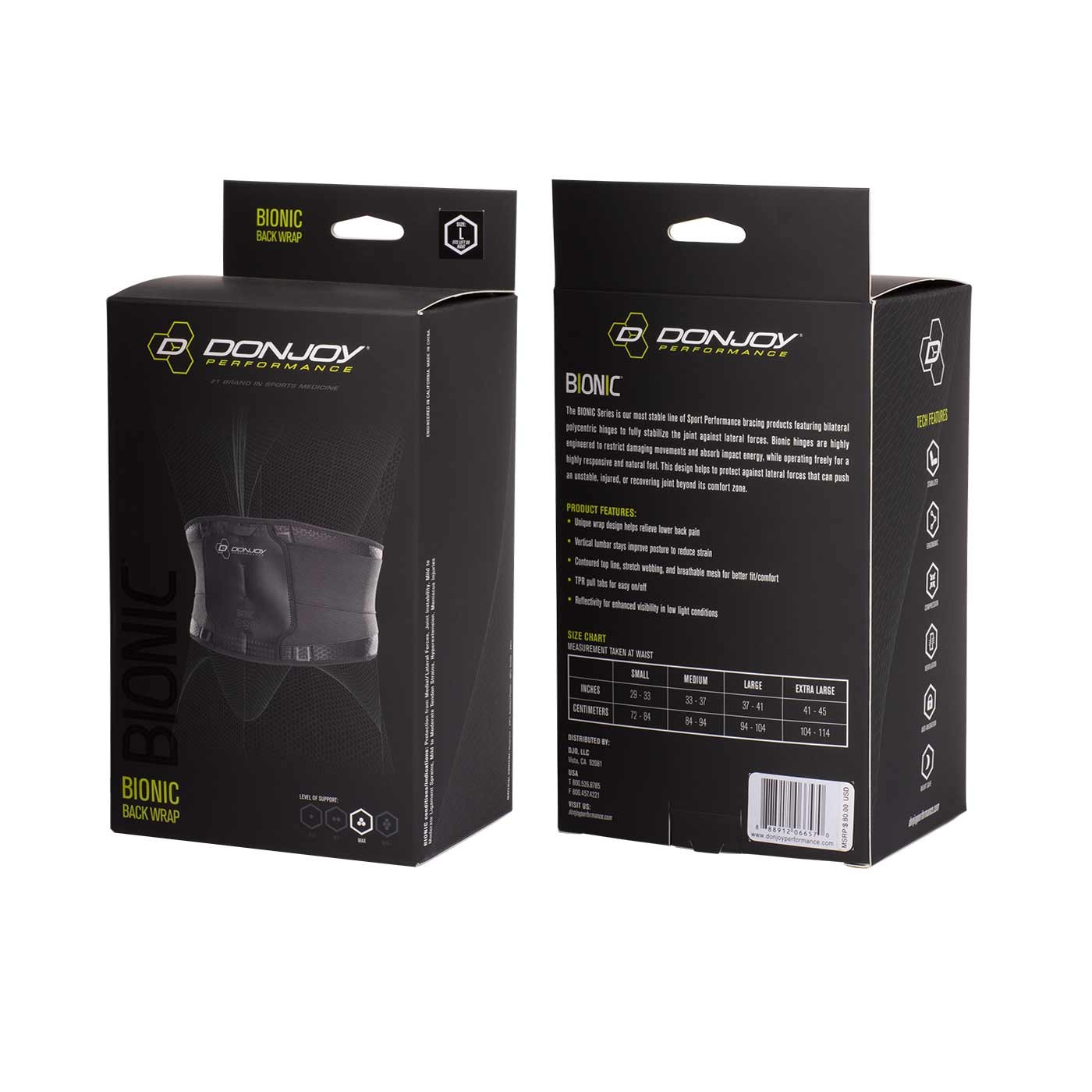 Our DONJOY Performance Bionic Back Wrap features four robust upright stays that help to protect against strains and pulls. The contoured top and bottom lines comfortably fits all body types, and provide the level of support the user needs. Ventilated material set helps breathability and stretch webbing allows for controllable, graduated compression around the torso.