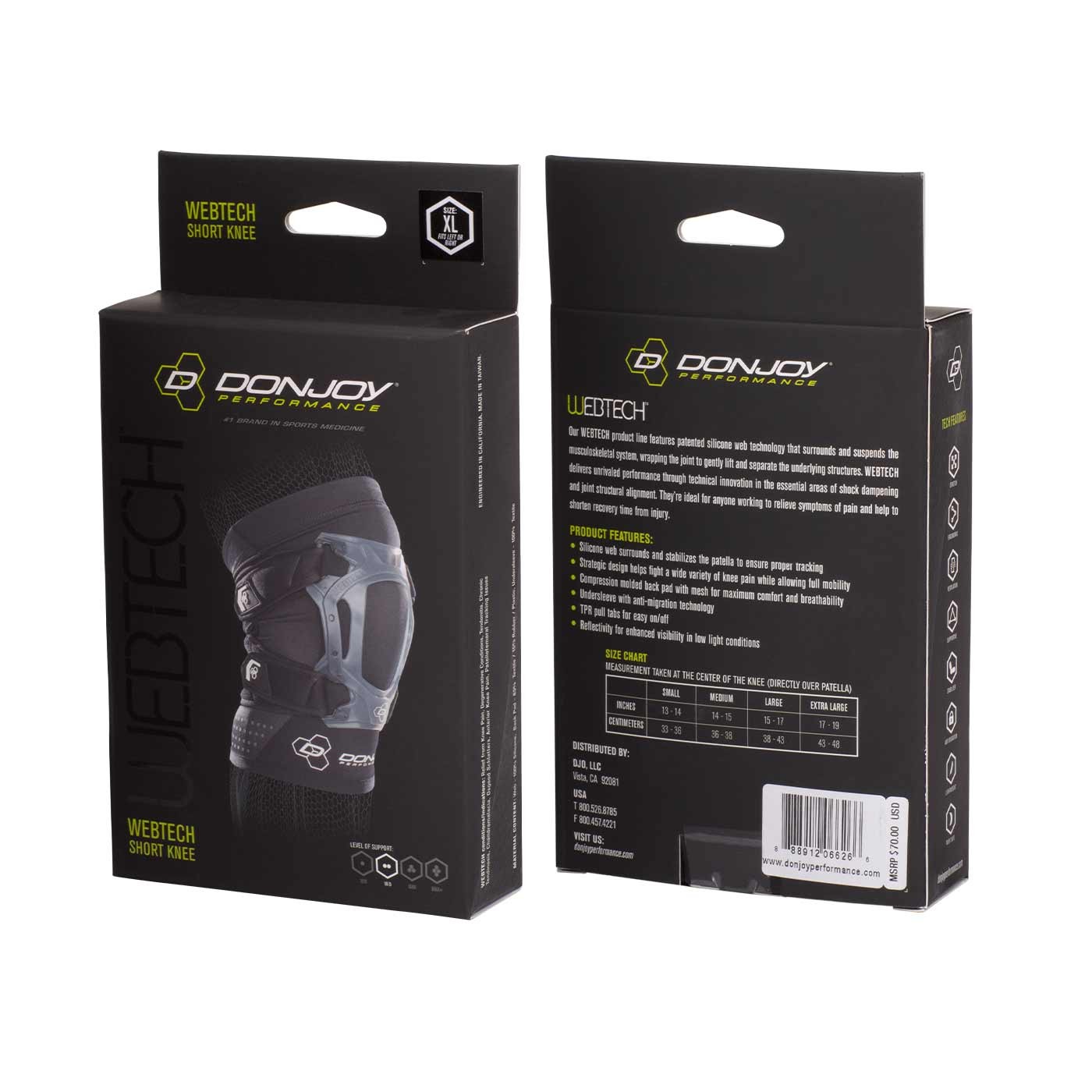 Our DONJOY Performance Webtech Short Knee Brace features an innovative three part system that is ideal for relieving common forms of knee pain often associated with sports injuries, overuse injuries and degenerative conditions. Specifically, the Short Knee features a unique web structure that evenly distributes pressure over the Quadriceps and Patellar Tendons, and helps to stabilize the patella and ensure proper tracking. Compression molded back pad adjusts easily to optimize fit and comfort, and a four way stretch lycra/mesh undersleeve eliminates hot sports and provides an added layer of protection. Compared to the Webtech Knee Brace, the Short Knee is approximately 50% shorter which makes it ideal for relieving pain often associated with tendonitis, commonly referred to as runner's and jumper's knee.